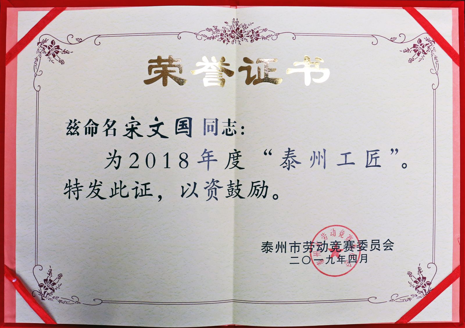 【追夢】一起草17c 蜜桃股份宋文(wén)國同誌(zhì)被授予“新時代泰州百名(míng)工匠”“五一(yī)勞動獎章(zhāng)”